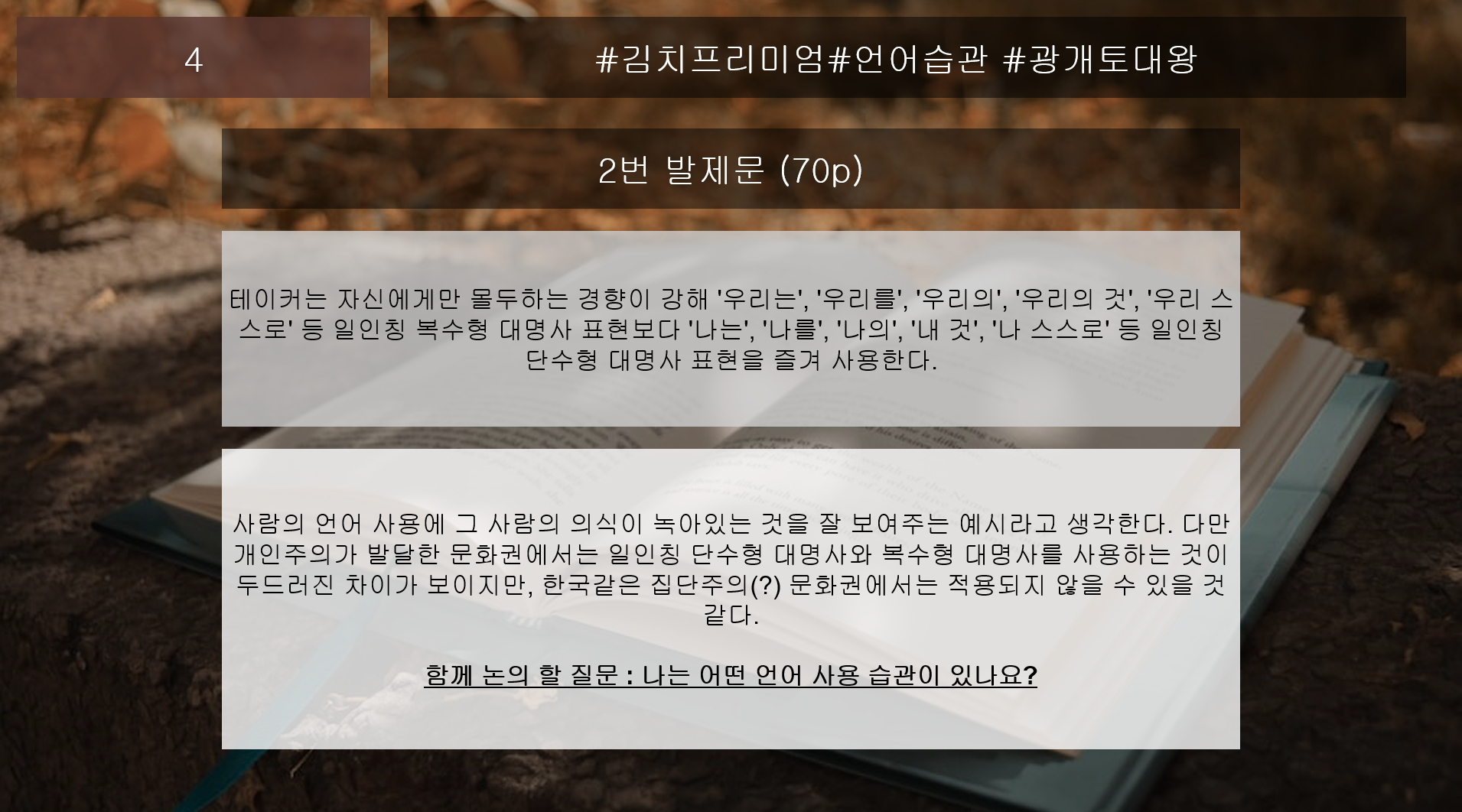 우리 라는 단어를 많이 쓰는데 내가 사용하는 우리는 이중적인 의미가 있는 것 같다. 그것은 책임지지 않으려는 & 공을 다같이 나누려는 느낌이 있었던 것 같은데, 아마 후자가 더 크지 않을까 싶다. 최근에는 긍정적인 표현들을 나의 대화문장에 많이 넣으려고 노력하고 있다. 언어 사용 습관이라는게 사람의 입체적인 가치들이 내포되어있는 단서이기 때문에 매사에 주의를 기울여야 겠다.