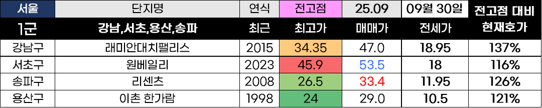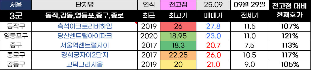 3급지 부터는 선호하는 단지들 위주로 상승 흐름을 보여줬고 전고점 대비 평균 135% 상승을 보여주었습니다.