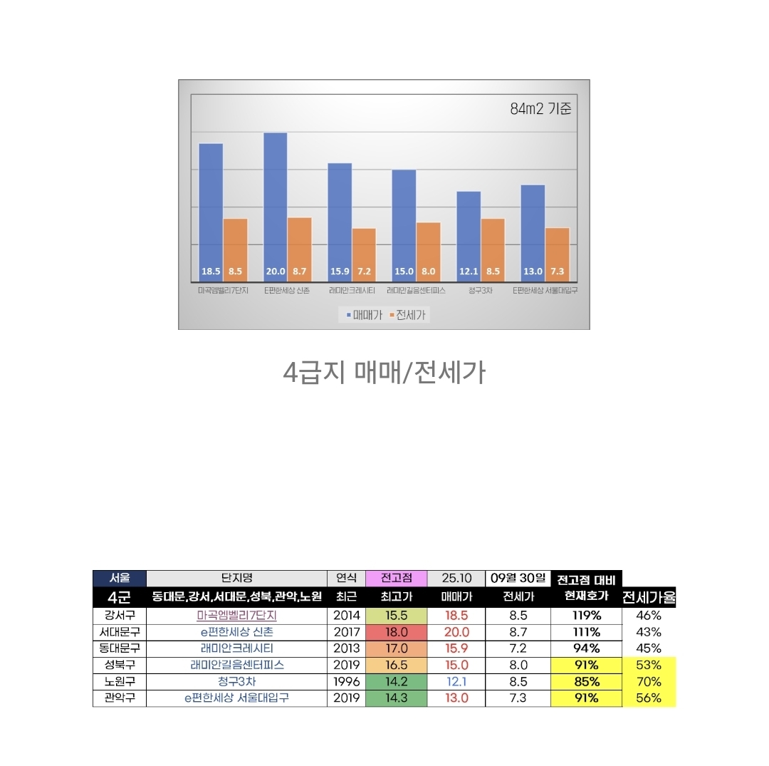 4급지는 상급지 대비 전세가율이 높아 가격에 거품이 덜 해보여진다. 랜드마크 또한 전고점을 상회하지않은 단지들도 꽤있어, 매매할 때 안전마진을 고려해볼 수 있을 것 같다.