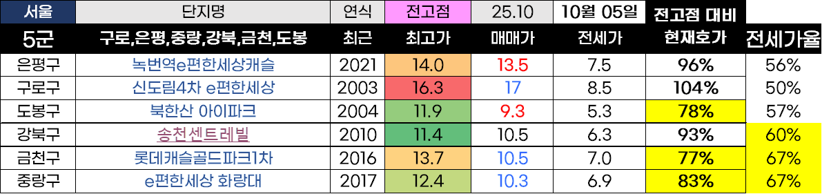 🪧 결론 : 은평 녹번 신축, 구로 신도림동 생활권, 강북 미아역 주변 가격 상승을 보여주고 있고, 그 외 5급지 단지는 아직 상승 흐름을 상대적으로 덜 받은 상태