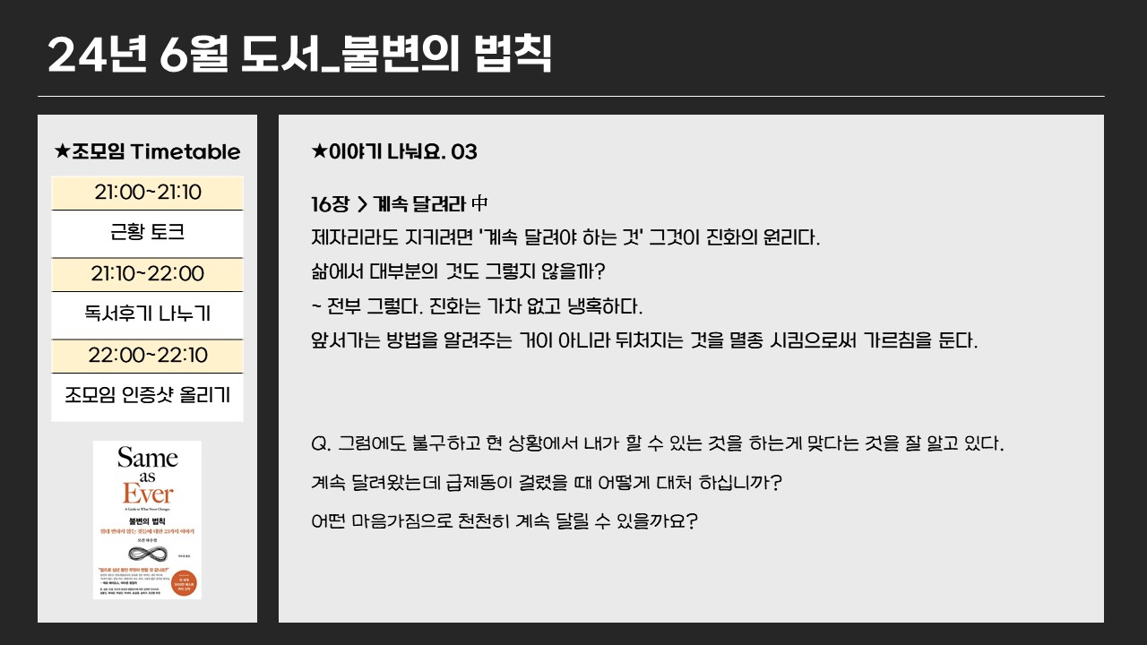 계속 달리다가 어떤 상황에 부딪쳐서 급제동이 걸린다면? 만약 그게 '성과가 안나서, 이게 맞나? 지겨워진 상황'이라고 가정해본다면 달리긴 보다 경보 수준의 속도를 갖고 싶다. 지금 실전반을 이주 했는데 거의 미친듯히 달리는 수준인 것 같다. 왜냐하면 나의 캐파도 그렇게 크지 않고 나는 아직 이런 속도로 많이 달려보지 않았기 때문인 것 같다. 계속 달리다 보면 나의 캐파도 넓어지고 그 안에서 우선순위를 세우면서 일의 양은 더 많아지지만 여유는 오히려 생겨버리는 그런 상태에 도달한다고 한다. (에이스반 튜터님들 예시..) 어떤 내가 목표하는 임계점이 있다면 그 것을 돌파할 때까지는 계속 달리다가, 나의 능력치 혹은 역량이 올라갔다고 생각한다면 그 이후부터는 속도를 조금 줄여서 마라톤급이 될 수 있도록 속도 조절이 필요하지 않을까 싶다.