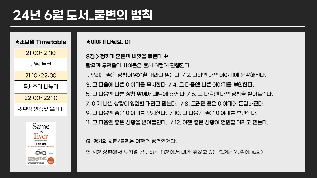 7번 나쁜 상황이 영원할 것이라고 믿는다 = 하락장이 시장됨 아 보수적으로 접근해야 겠구나라는 생각