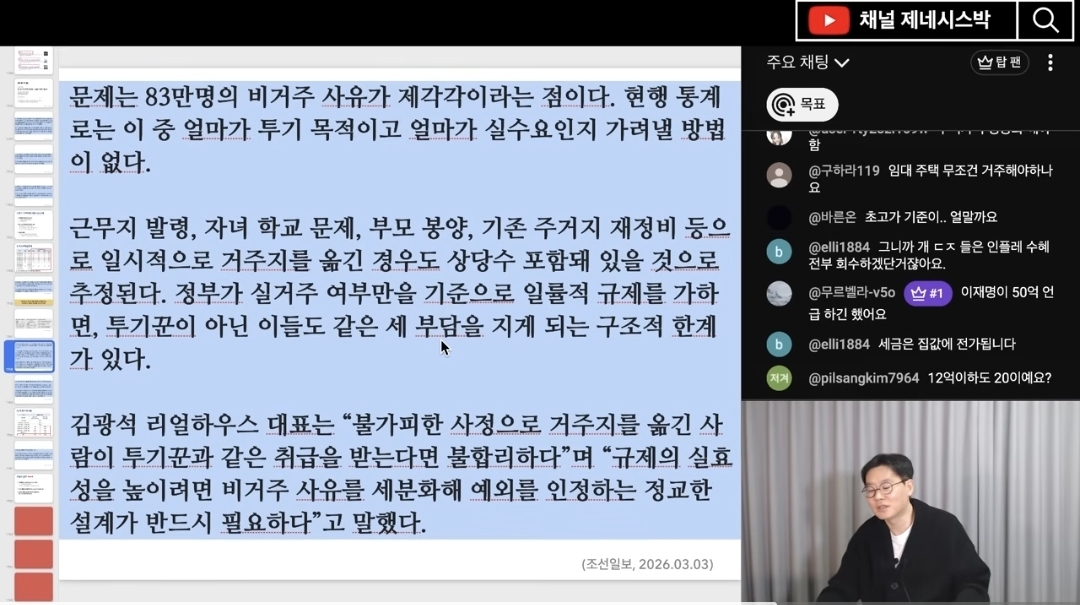 현실적인 어려움: 비거주 사유(직장, 교육 등)가 다양한데 이를 일률적으로 규제할 경우 선의의 피해자가 발생할 수 있어, 정책 설계가 정교해야 한다는 지적이 있습니다 (6:49, 14:52).