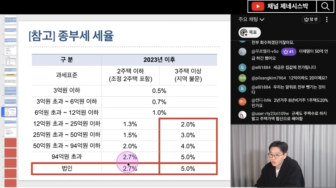 다주택 정리: 3주택 이상인 경우 중과세를 피하기 위해 주택 수를 줄이는 전략이 필요합니다 (22:58).