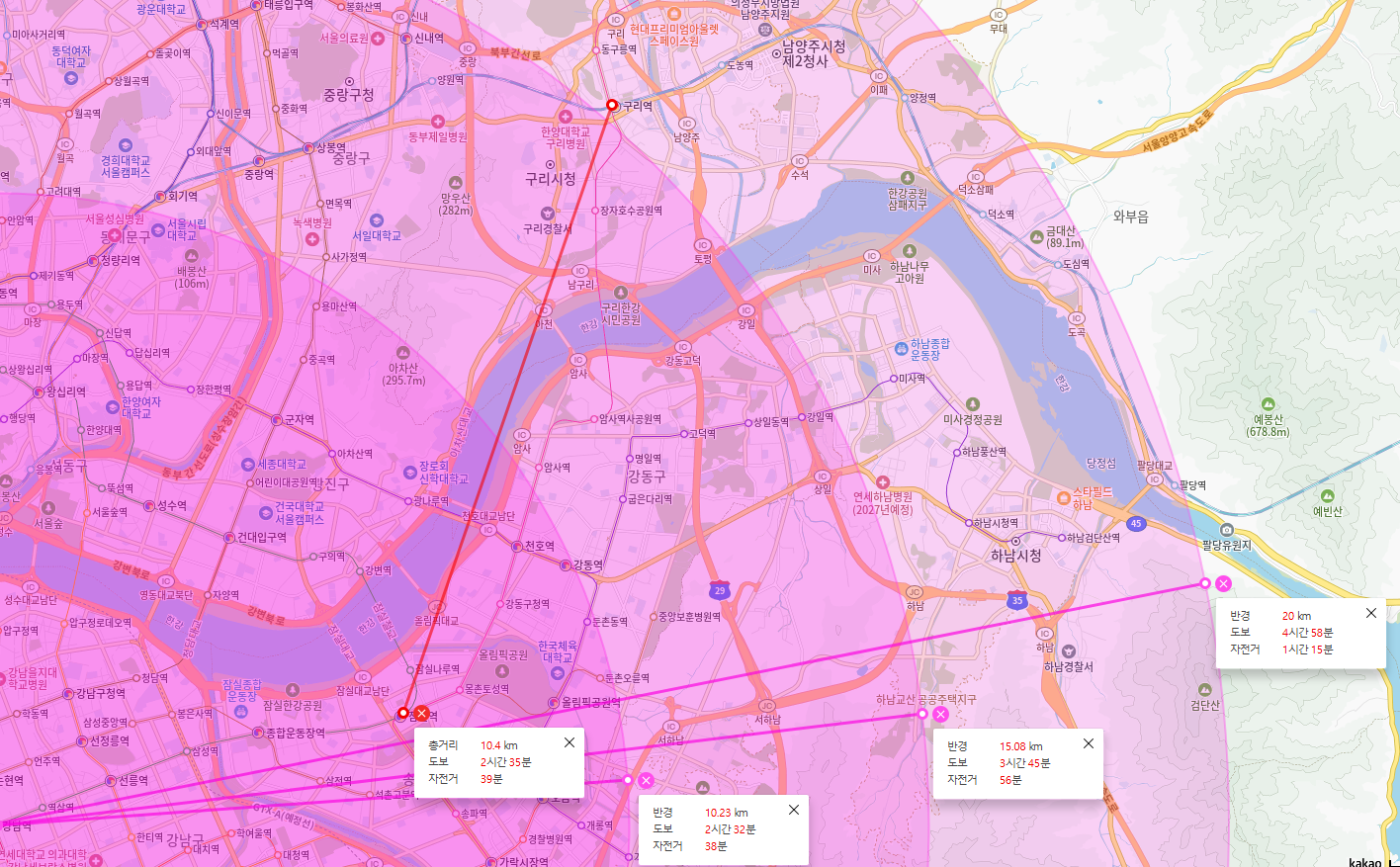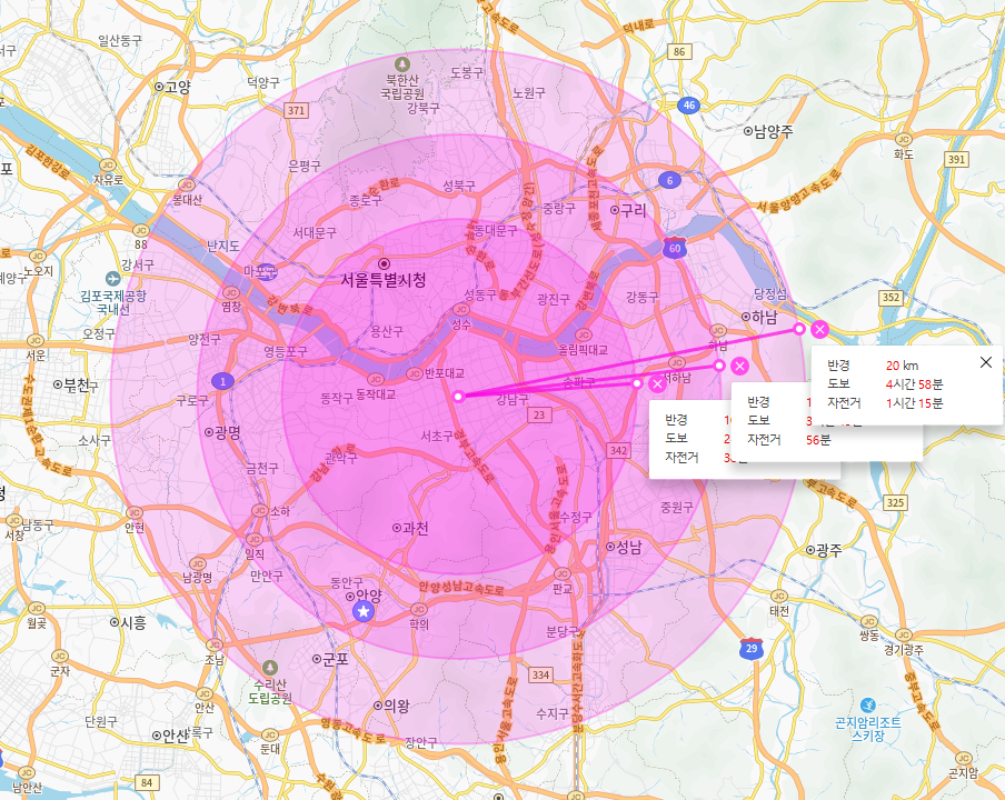 강남으로 부터의 10, 15, 20km 떨어져 있는 곳을 표시한 것이고