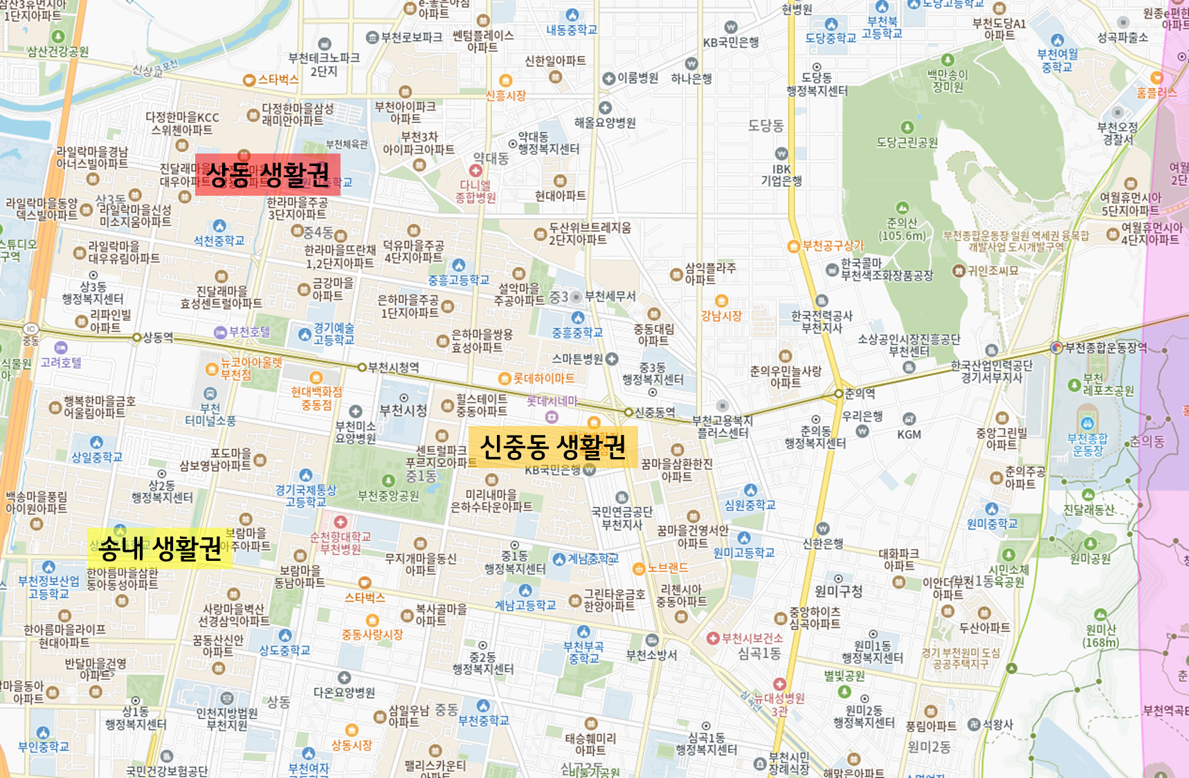 상동과 중동(신중동)은 반듯한 아파트 택지로 구성되고