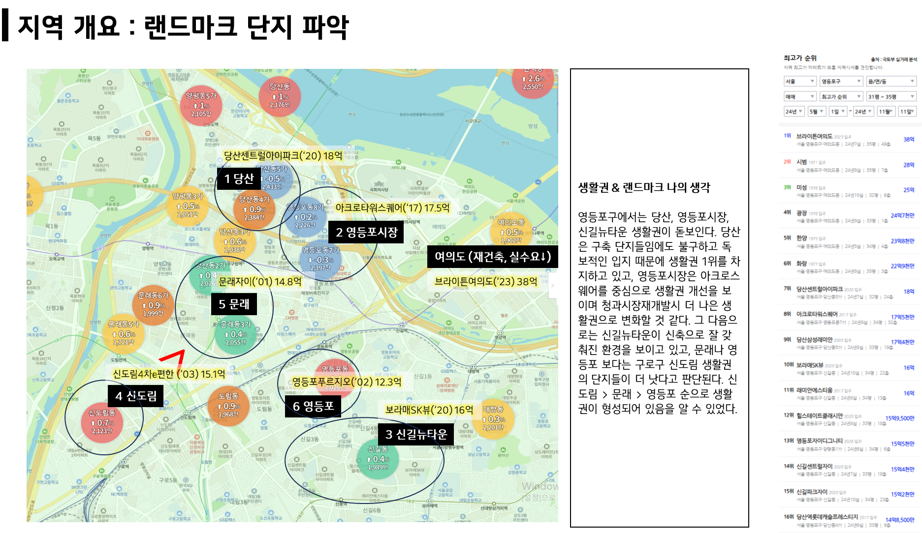 영등포구에서는 당산, 영등포시장, 신길뉴타운 생활권이 돋보인다. 당산은 구축 단지들임에도 불구하고 독보적인 입지 때문에 생활권 1위를 차지하고 있고, 영등포시장은 아크로스웨어를 중심으로 생활권 개선을 보이며 청과시장재개발시 더 나은 생활권으로 변화할 것 같다. 그 소ㄷ다음으로는 신길뉴타운이 신축으로 잘 갖춰진 환경을 보이고 있고, 문래나 영등포 보다는 구로구 신도림 생활권의 단지들이 더 낫다고 판단된다. 신도림 > 문래 > 영등포 순으로 생활권이 형성되어 있음을 알 수 있었다.