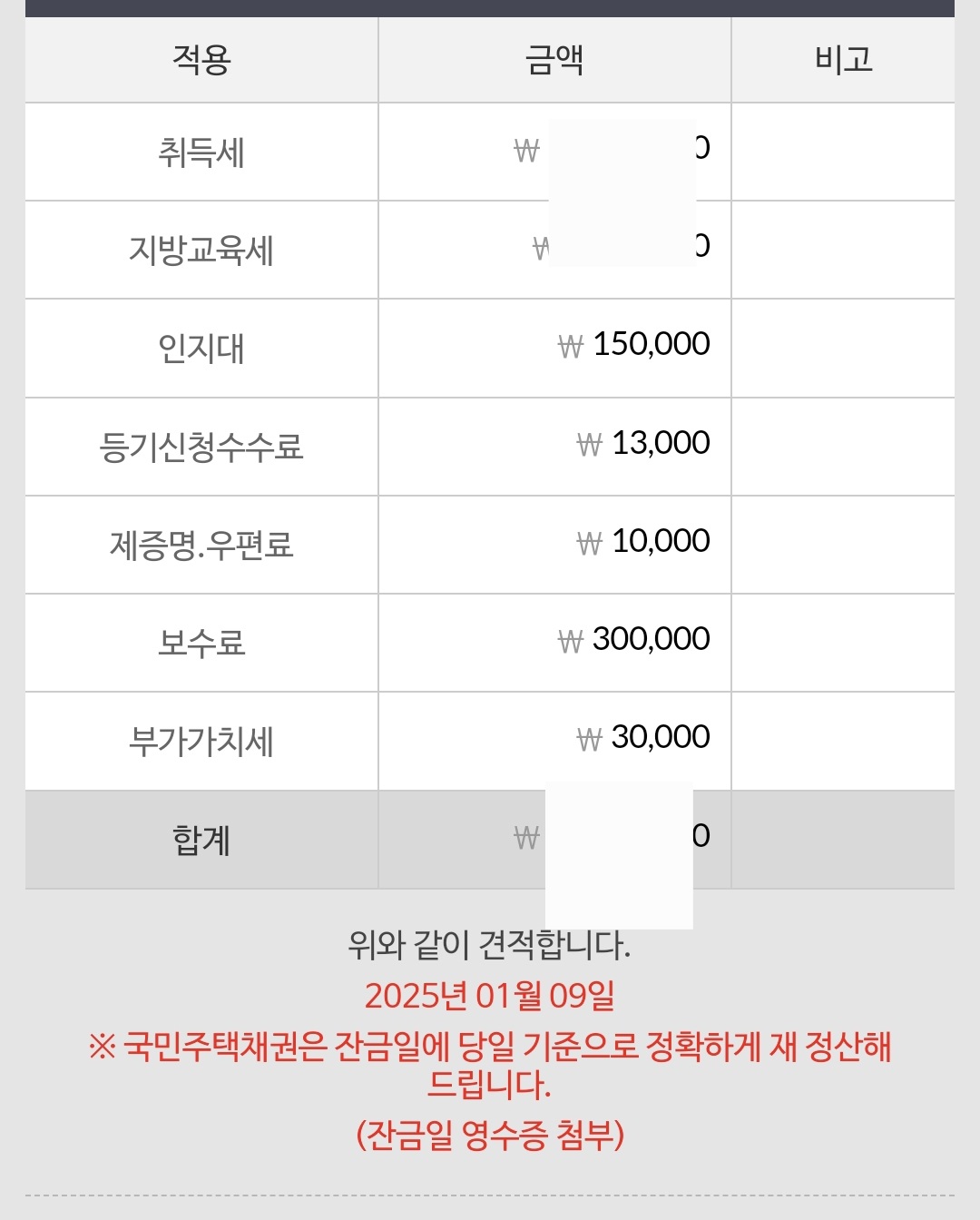 채권매입료  :  부동산 취득시 필수 항목인 국민주택채원인데 은행/증권사에 팔고 차액을 부담할 수 있으며 거래 당일에 직접 체크해보시고 법무사님이 제안한 금액과 맞는지 더블체크해보셔야 합니다