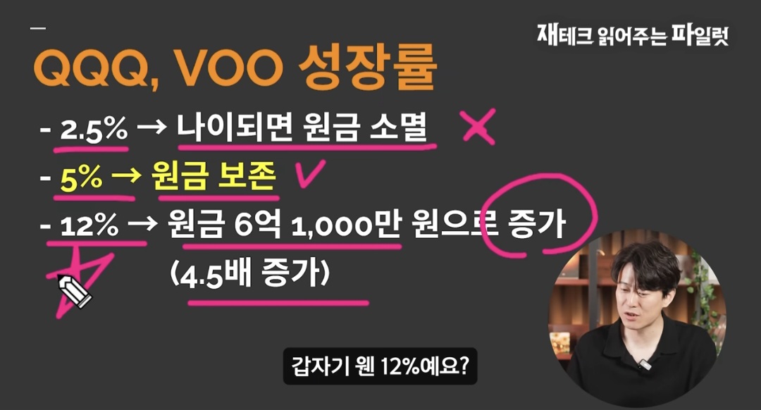 단순 배당 수령을 넘어 미국 지수 추종 ETF의 연평균 상승률(역사적으로 약 10~12%)을 고려하면, 원금을 보존하거나 오히려 자산이 증식될 가능성이 높다고 강조합니다.