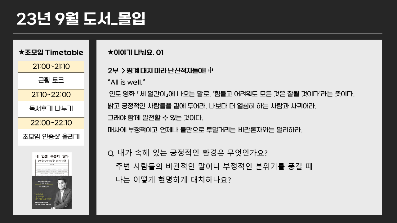 최근 XX 재수강하면서 나 자신을 혼내기 위해 운영진을 신청했다고 XX학교 선배에게 이야기하니, 되기 쉽지 않겠지만 나보다 너 나은 사람들이 있는 환경에 나를 밀어넣으라는 조언을 얻었다. 물론 나는 떨어졌지만! 지난 추석, 연휴를 보내면서 스스로가 너무 나태해진 것을 느끼고 실준 재수강을 하고 있는데, 앞마당 5-6개를 만든 시점에서 기본기를 재점검하고 초심을 잡을 수 있었던 좋은 기회였다고 생각한다. 사실 투자 공부를 하면서 같은 목표를 향해 달려가는 사람들이 아닌 다른 부류와 투자에 대해서 이야기를 할 때 서로에 대해서 비난하는 모습이 보이고, 이따금 본인의 부를 자랑하기에 바쁜 사람들을 종종 만나게 된다. 그럴 때면 예전에는 '왜 저러지, 대화 하기 싫다.' 라는 생각에 휩싸였는데 최근에는 부정적인 말들을 하는 사람들(감정 쓰레기통)은 다음 만남 때 약속을 잡지 않게 되고, 일상속에서 부를 과시하는 사람들에 대해서는 '오 그렇군요, 멋지시네요. 엄지척' 을 날리면 스스로 스트레스를 덜 받게 되는 것 같다. (대화의 취사 선택)이런 식으로 최근에는 나와는 반대생각을 하는 또는 비관적인 말을하는 사람들은 대처하는 성숙한 방법을 취하고 있다.