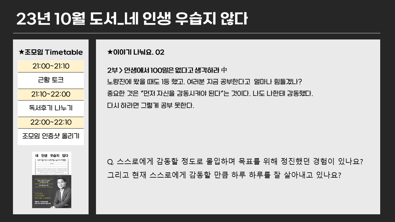 책을 읽으면서 나의 고등학교 입시 생활을 떠올리게 되더라. 아무래도 공무원 시험관련 강의를 하시고 그에 대한 이야기를 풀어나가셨기 때문에 나의 학창시절을 떠올릴 수 밖에 없었다. 사실 지금 생각해보면 입시 때가 내인생에 가장 몰입도가 높았던 시기였다. 다시 그렇게 공부하라면 절대 할 수 없을 것 같다. (물론 공부를 썩 잘하진 못했지만..) 그 이후에는 삼십대 초반까지는 정말 미친듯이 놀기에 바빳던거 같다. 일하고 놀고, 일하고 놀고를 반복하며. 그러다가 월부라는 환경에 들어오게 되면서 저녁시간에는 투자공부를 하고 주말에는 임장을 가고, 나름대로 굉장히 열심히 살고 있다고 생각된다. (하루를 잘 견뎌내고 있다는 말에 공감합니다.) 감동? 까지는 아니지만 그래도 남들대비 부끄럼없이 살고 있다는 거는 확실한 것 같다. (물론 더 열심히 해야한다.. 나태해지지말자)
