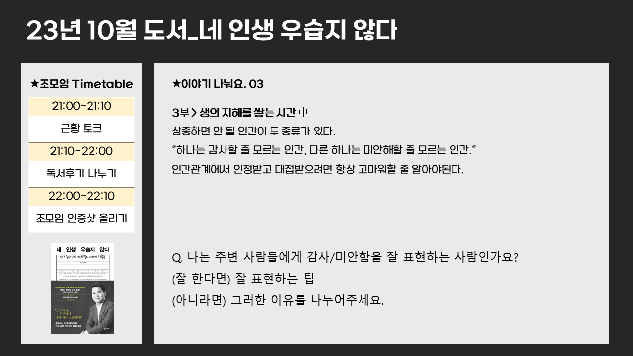 인간관계에서 인정받고 대접받으려면 항상 고마워할 줄 알아야한다는 말, 너무 마음에 와닿았다. 안그래도 오늘부터 감사일기를 쓰기로 마음 먹었는데, 모든 문장을 '감사합니다.'라고 끝내고 나니 그냥 사소한 하나하나의 것들도 다 감사하고, 내가 이렇게 글을 쓰고 있다는 것에도 감사함을 느낄 수 있었다. 이처럼 감사하다는 표현은 되게 아름다운 표현인데, 주변을 보면 고맙다/미안하다를 참으로 안하는 사람들이 많아서 서로 빈정상할 때가 많았던 것 같다. 빈정상할 때면 나의 기분도 썩 좋지는 않기 때문에, 나는 감사하다/고맙다라는 표현을 매우 자주주하는 편이고 상대방의 호감을 사기 위한 사회생활을 한가지 무기로 사용하고 있다. 나를 조금은 낮추면서 상대방에게 무언가를 표현한다는 것은 상대를 존중한다는 의미가 될 수 있기 때문에 사소한 일상 속에서도 상대방과 나와의 관계를 돈독하게 하기 위해서 고맙다/미안하다 라는 표현을 잘 쓰는 것 같다. (미안하다고 먼저 말을 뱉어버리면 상대방이 화내려고하는 상황을 막을 수 있더라.)
