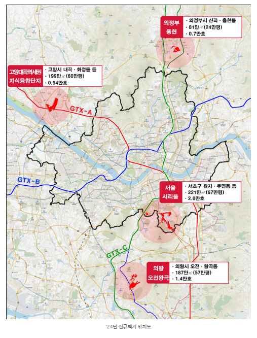 강남 생활권인 서초 서리풀 지구에 2만호, 펜타역세권인 고양 대곡과 의왕 오전왕곡, 의정부 용현 3개 지구...