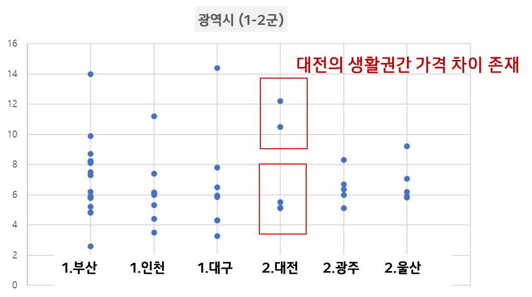 3) 대전의 생활권 가격 밴드가 두 부류로 나눠지고,