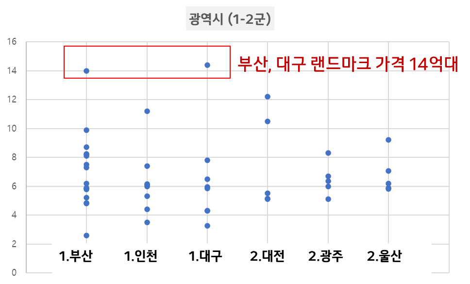 부산과 대구의 랜드마크의 매매 호가는 비슷한 수준 (14억 수준)